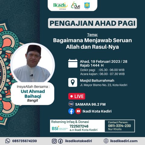 IKUTILAH PENGAJIAN UMUM AHAD PAGI IKADI KOTA KEDIRI Kepada Ykh. Jamaah Ikadi dan Umat Islam Kediri dan sekitarnya ================================== ln syaa ALLOH Hari : Ahad, 19 Pebruari 2023 / 28